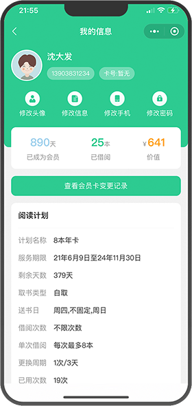 展示借阅数量、借阅价值、押金金额、服务有效期、续费记录、借阅次数等信息