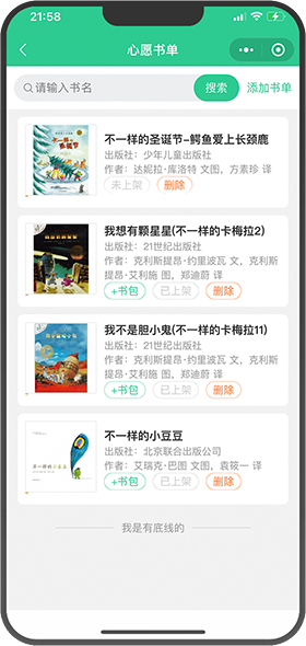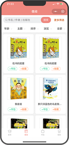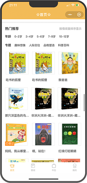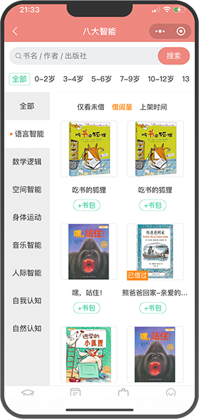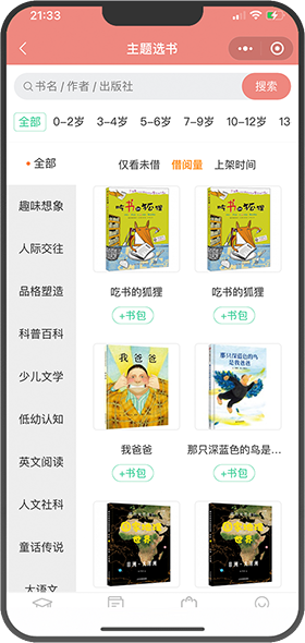 搜索书名,根据年龄段、书籍标签、书架、语种、出版社等自助选书,也可以扫码借阅