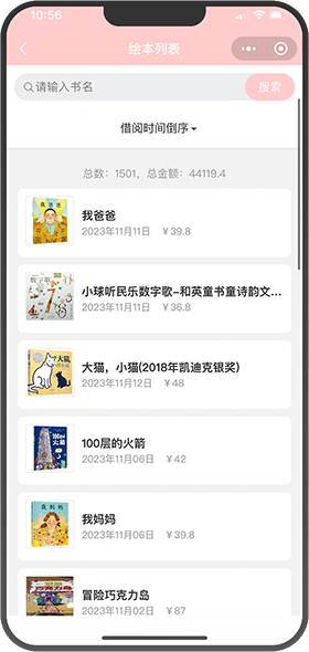 展示详细阅读列表封面图,包含总数量、总金额,并可搜索查询